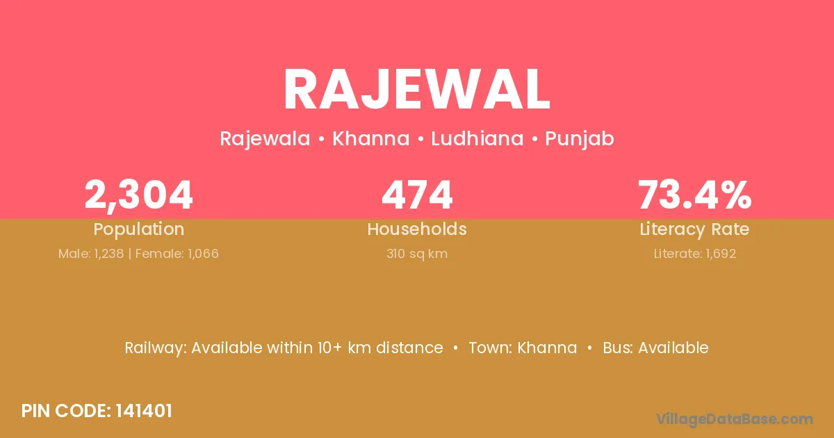 According to Census 2011 information, the village code of Rajewal village is 141114.