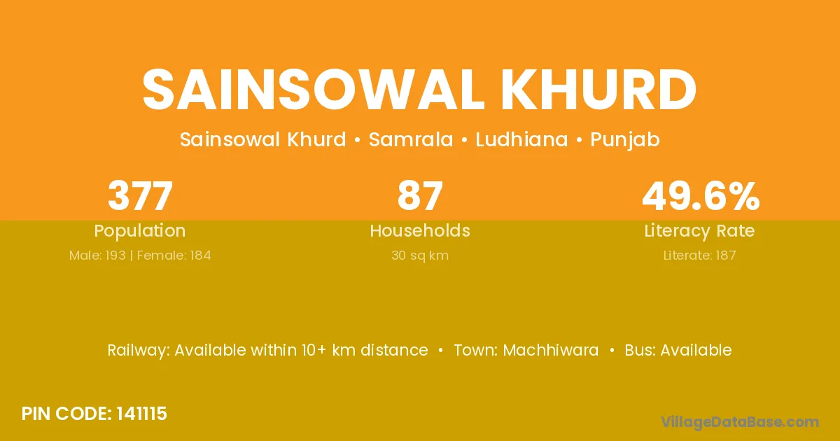 Sainsowal Khurd village has a total population of 377 people, of which 193 are males and 184 are females.