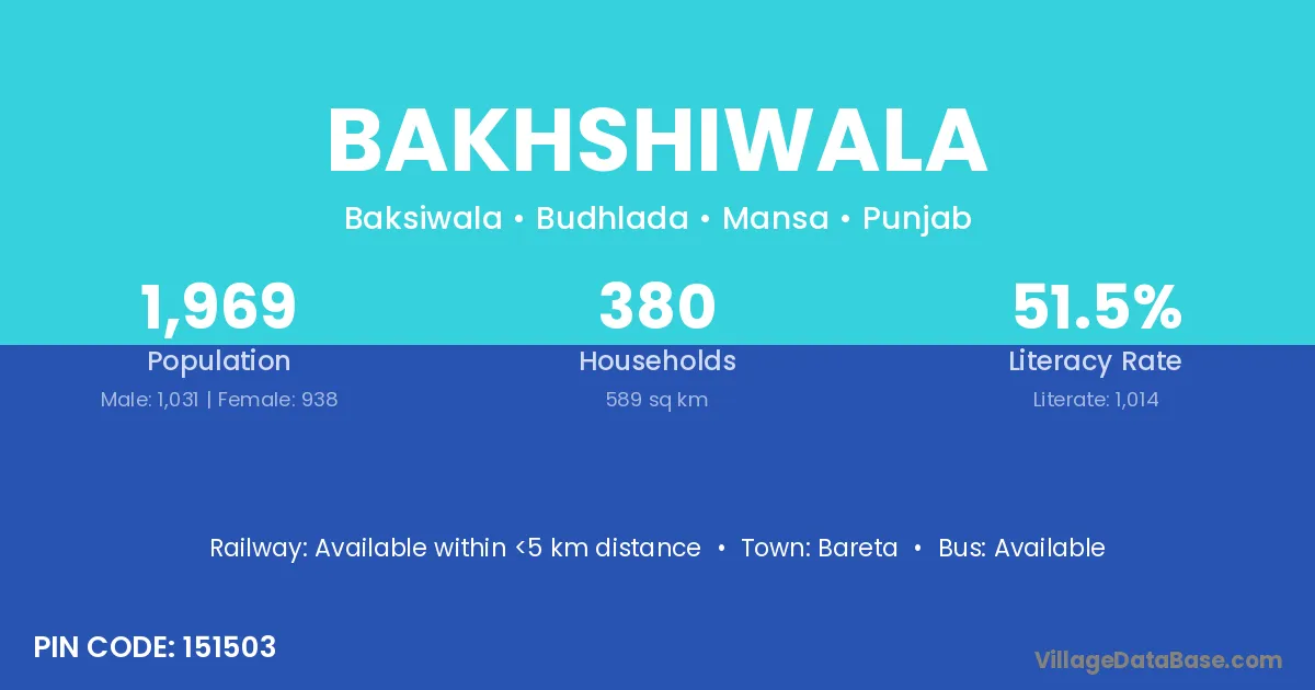 Bakhshiwala village has a total population of 1,969 people, of which 1,031 are males and 938 are females.