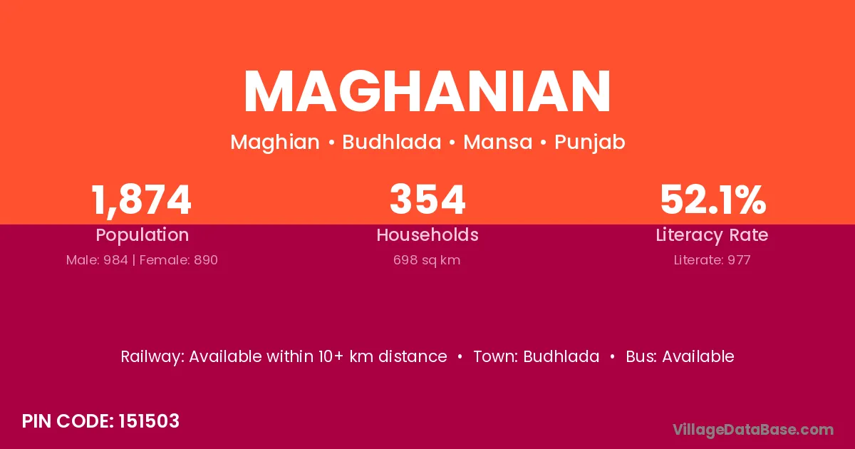 Maghanian village has a total population of 1,874 people, of which 984 are males and 890 are females.