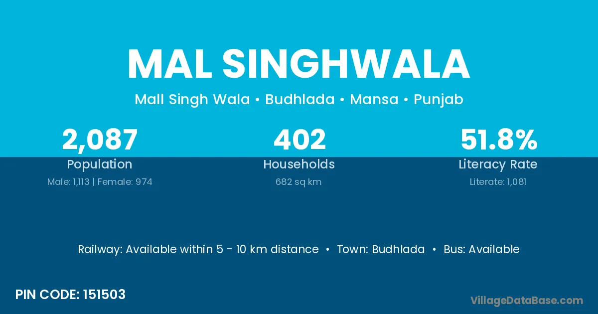 Mal Singhwala village has a total population of 2,087 people, of which 1,113 are males and 974 are females.