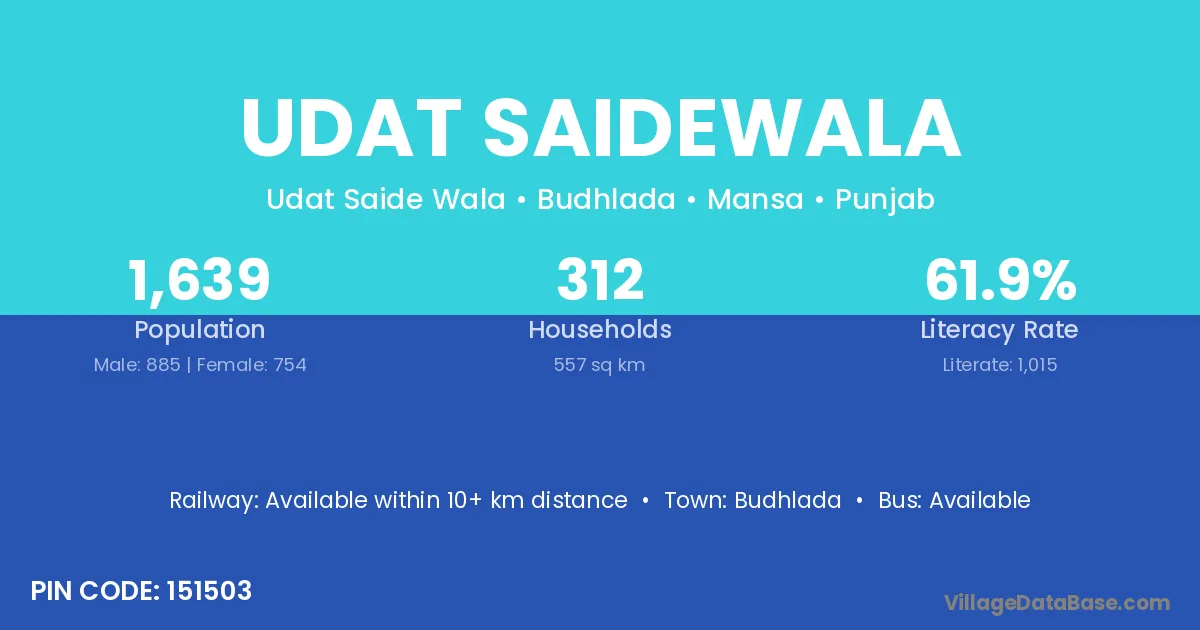 Udat Saidewala village has a total population of 1,639 people, of which 885 are males and 754 are females.