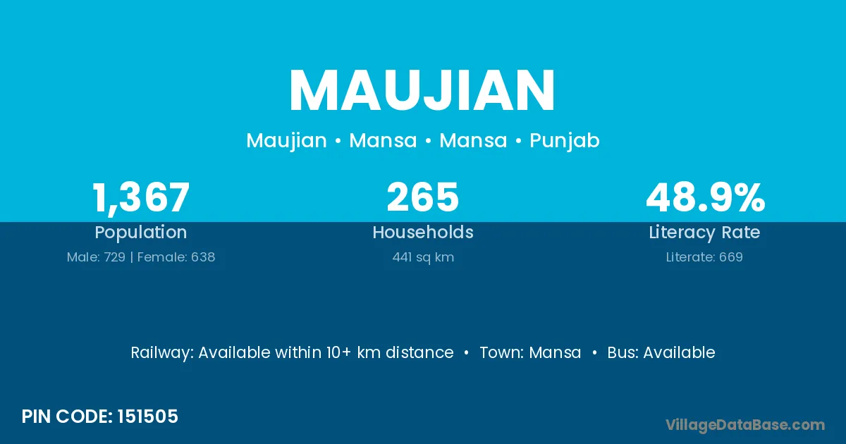 Maujian village has a total population of 1,367 people, of which 729 are males and 638 are females.