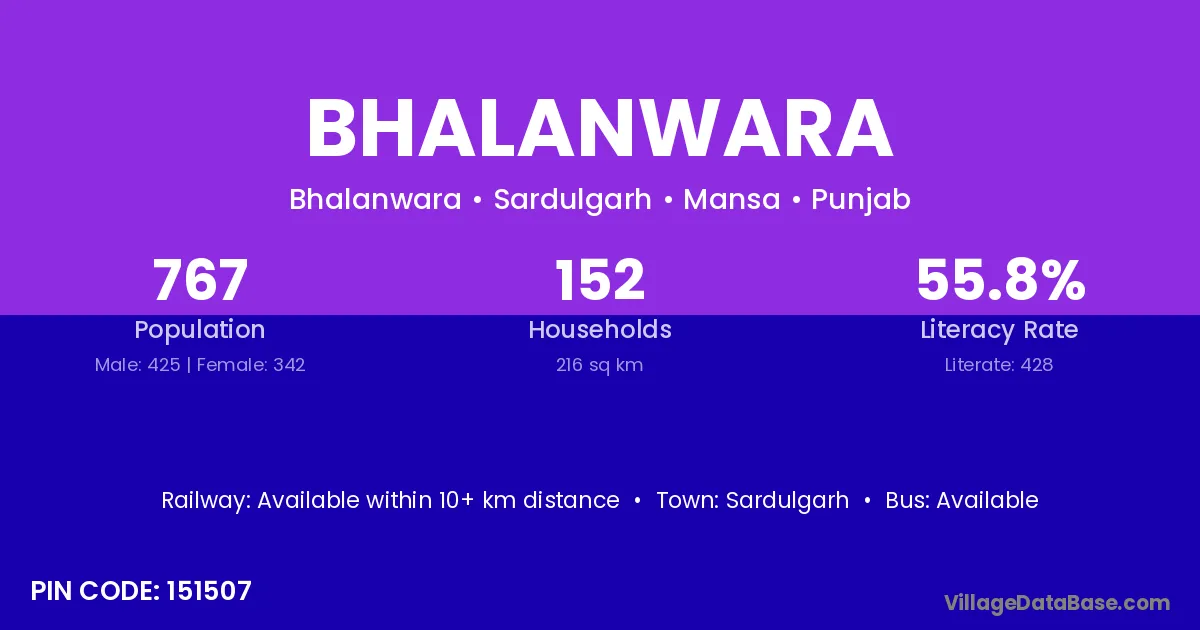 Bhalanwara village has a total population of 767 people, of which 425 are males and 342 are females.