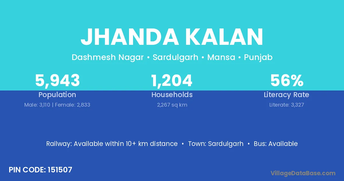 Jhanda Kalan village has a total population of 5,943 people, of which 3,110 are males and 2,833 are females.