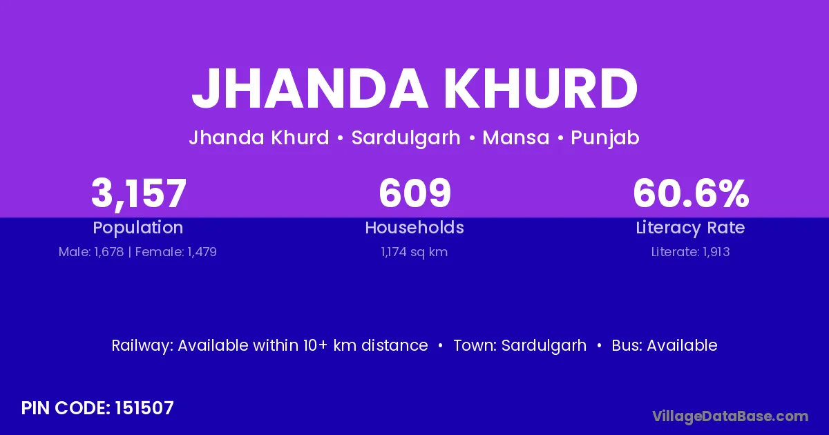 Jhanda Khurd village has a total population of 3,157 people, of which 1,678 are males and 1,479 are females.
