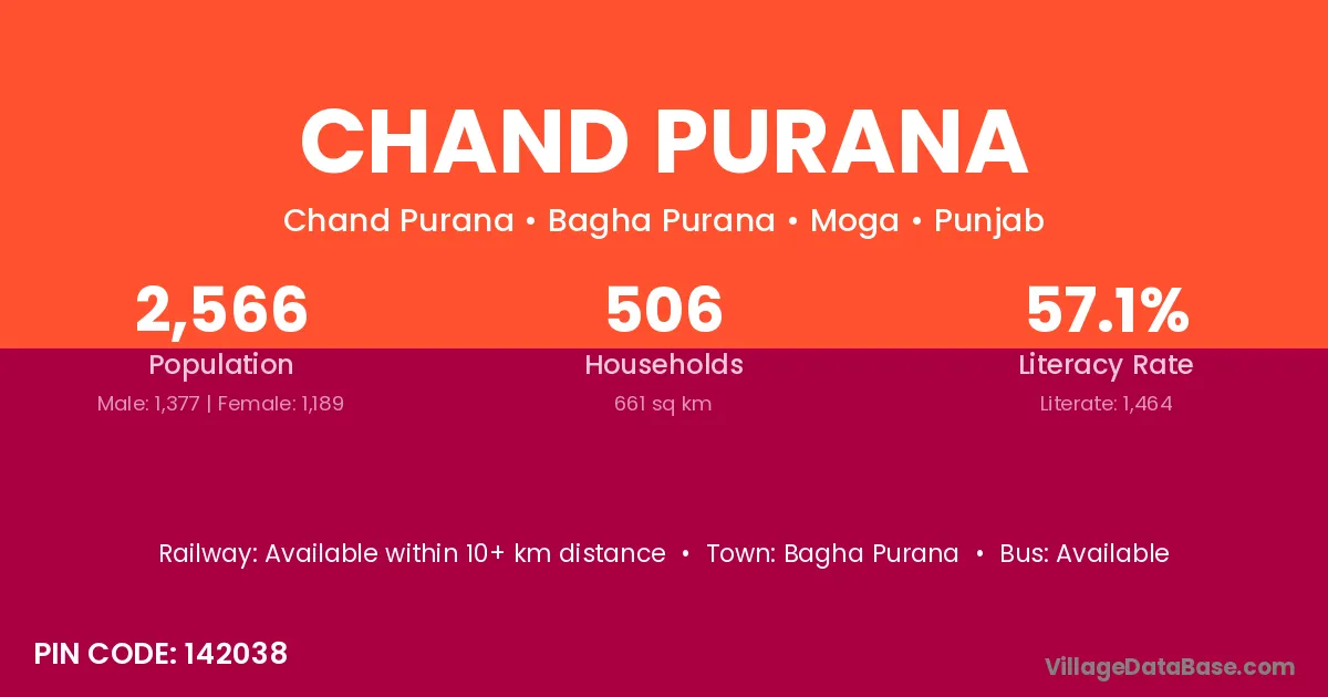 Chand Purana village is located in the Bagha Purana Tehsil of the Moga district in Punjab .