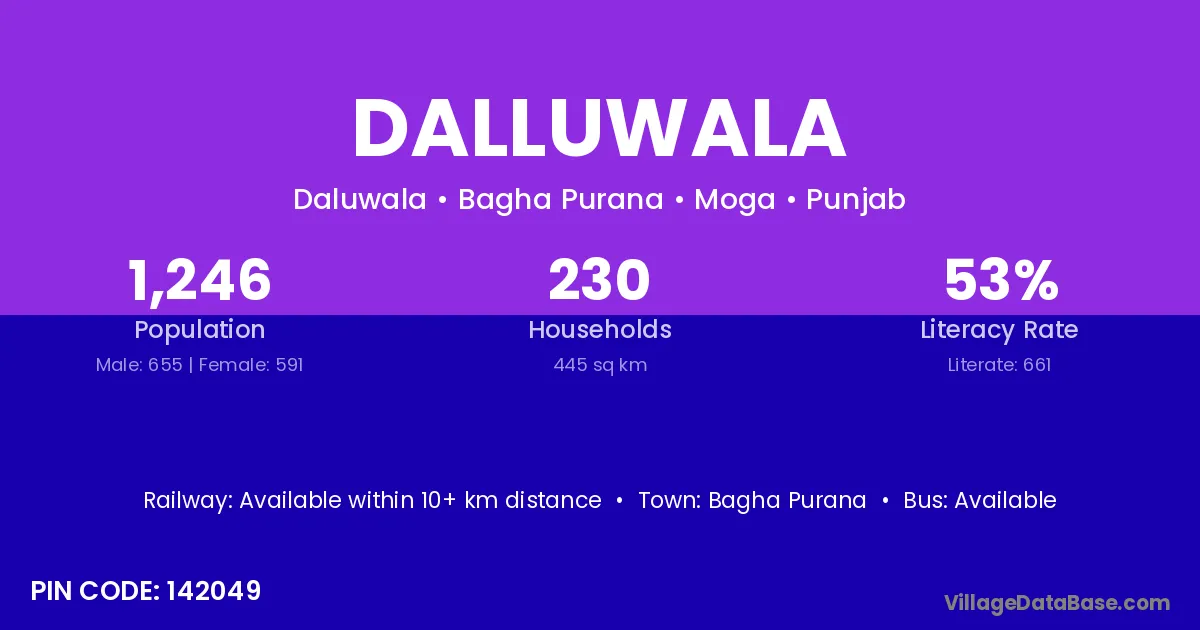 Dalluwala village has a total population of 1,246 people, of which 655 are males and 591 are females.