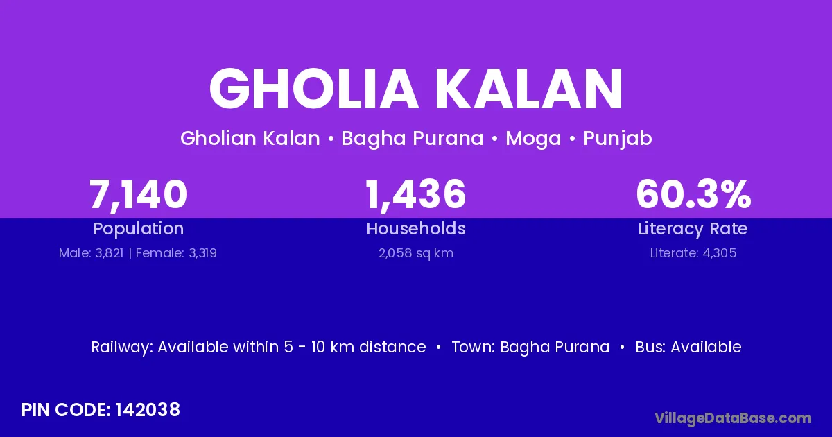 According to Census 2011 information, the village code of Gholia Kalan village is 142038.