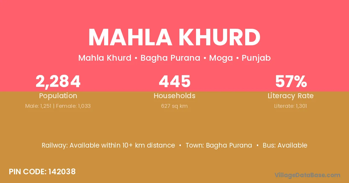 Mahla Khurd village has a total population of 2,284 people, of which 1,251 are males and 1,033 are females.