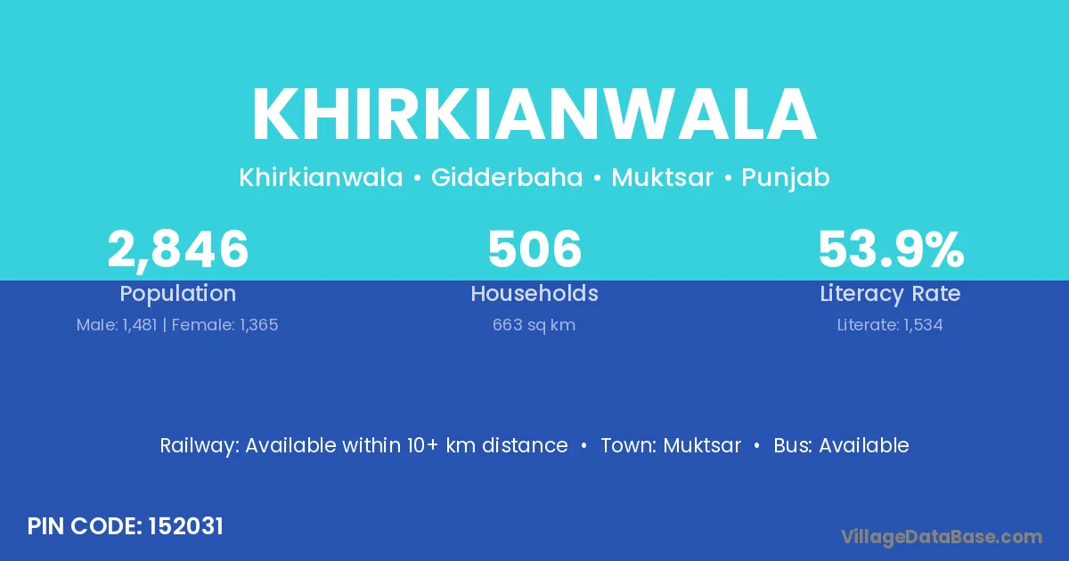Khirkianwala village has a total population of 2,846 people, of which 1,481 are males and 1,365 are females.