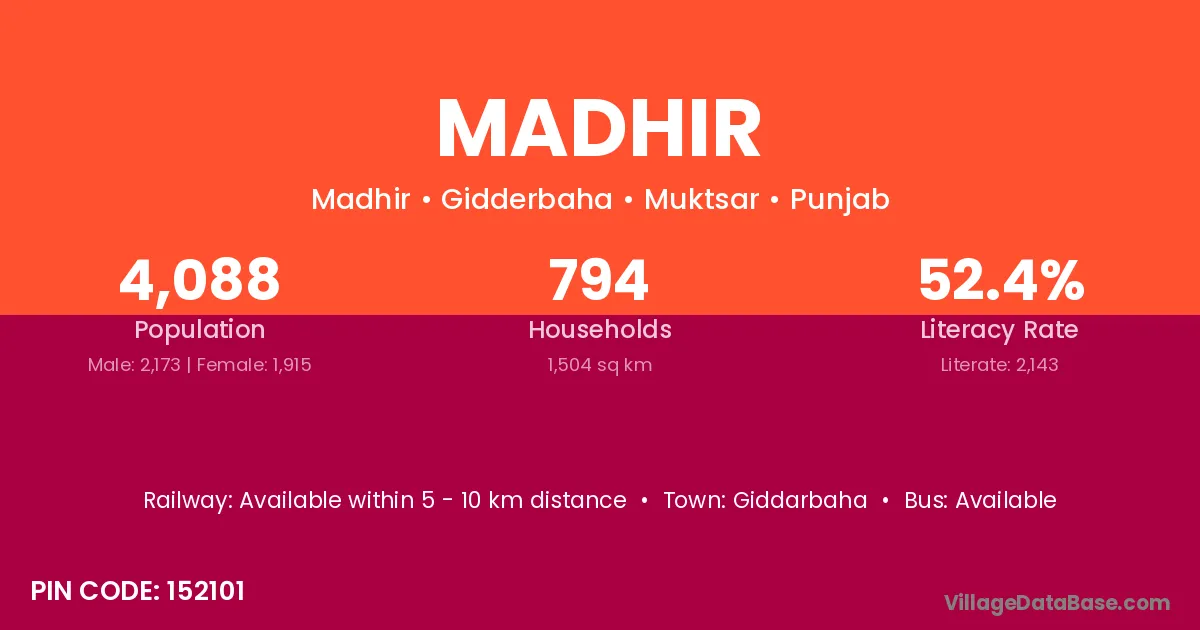 Giddarbaha is the nearest town to Madhir village for major economic activities