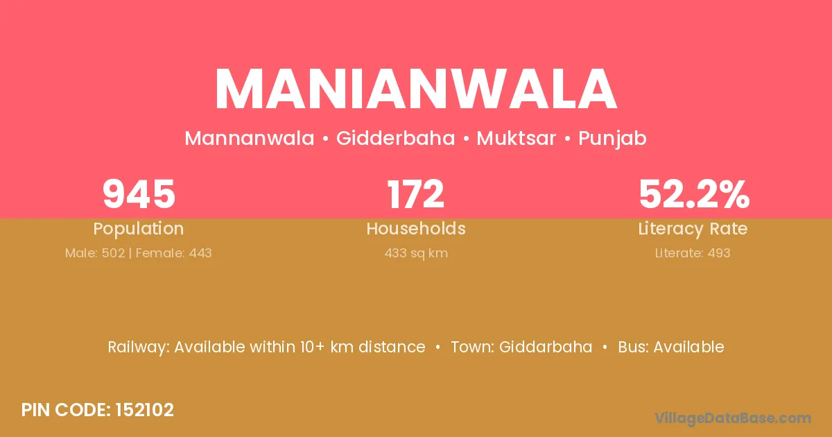 Manianwala village has a total population of 945 people, of which 502 are males and 443 are females.