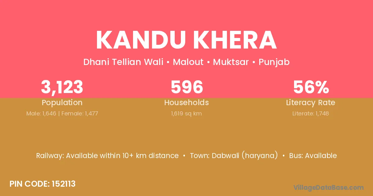 Kandu Khera village has a total population of 3,123 people, of which 1,646 are males and 1,477 are females.