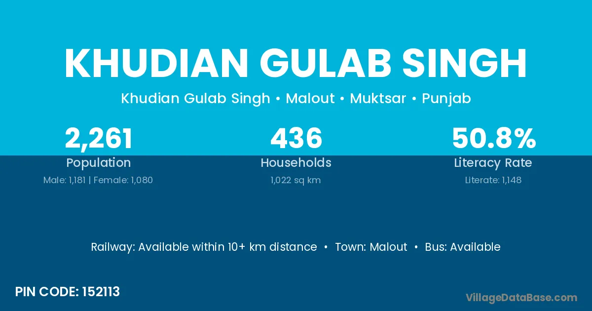 Malout is the nearest town to Khudian Gulab Singh village for major economic activities