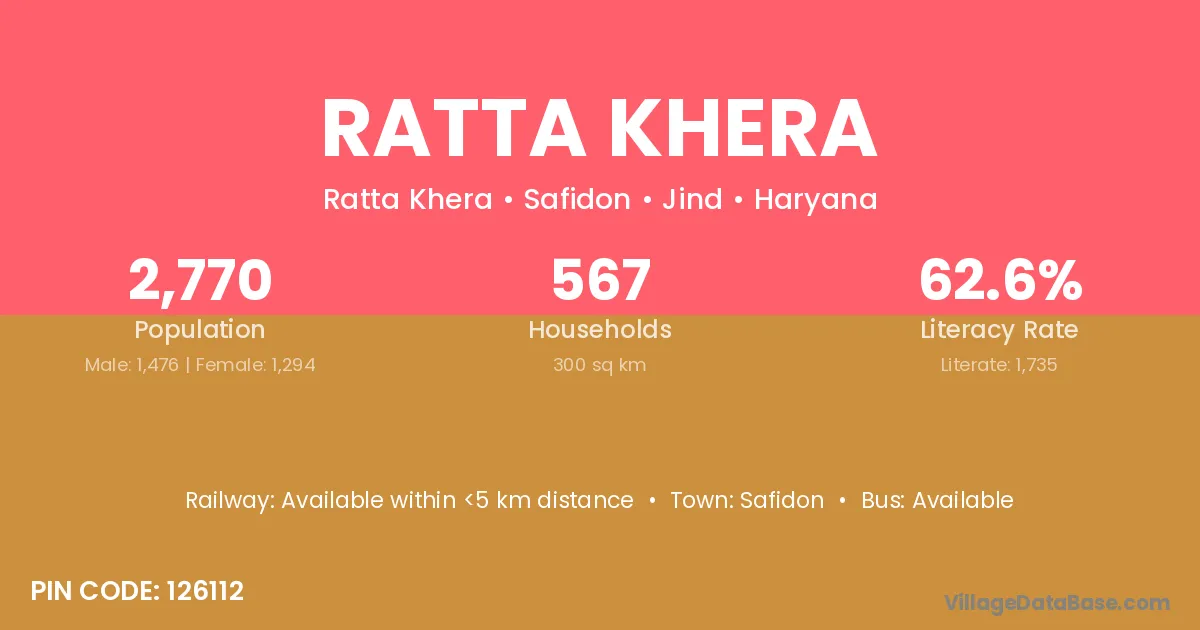 The literacy rate of Ratta Khera village is 59.48%. Male literacy stands at 65.47% and female literacy at 52.60%.