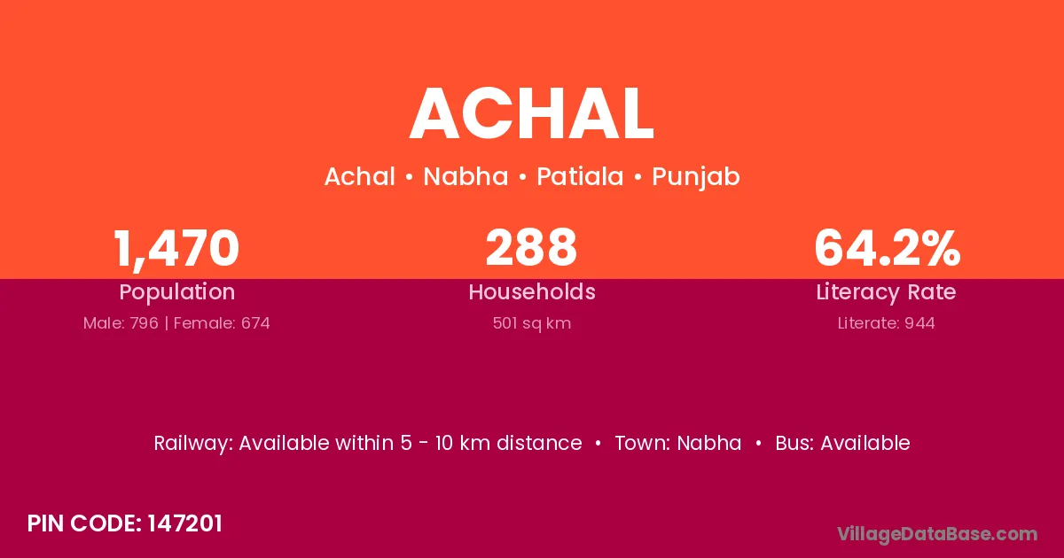 According to Census 2011 information, the village code of Achal village is 147201.