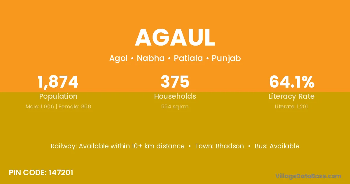 According to Census 2011 information, the village code of Agaul village is 147201.