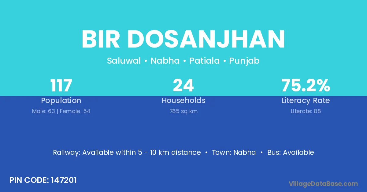 Bir Dosanjhan village has a total population of 117 people, of which 63 are males and 54 are females.