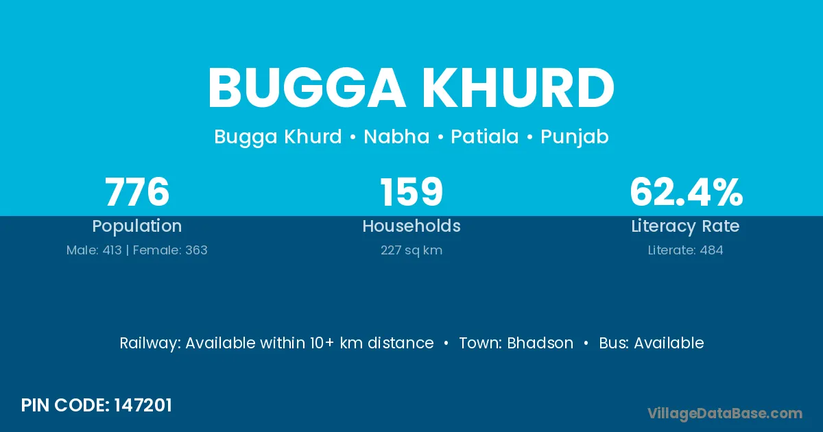 According to Census 2011 information, the village code of Bugga Khurd village is 147201.
