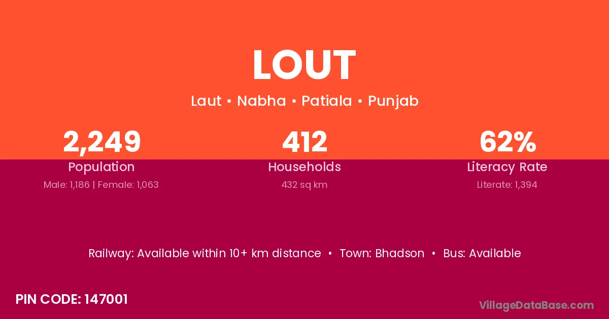 Lout village has a total population of 2,249 people, of which 1,186 are males and 1,063 are females.