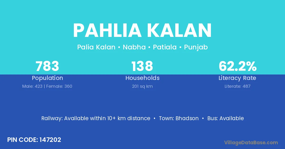 According to Census 2011 information, the village code of Pahlia Kalan village is 147202.
