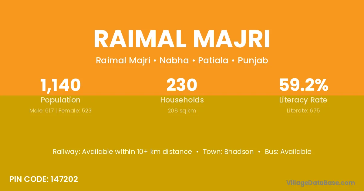 Bhadson is the nearest town to Raimal Majri village for major economic activities