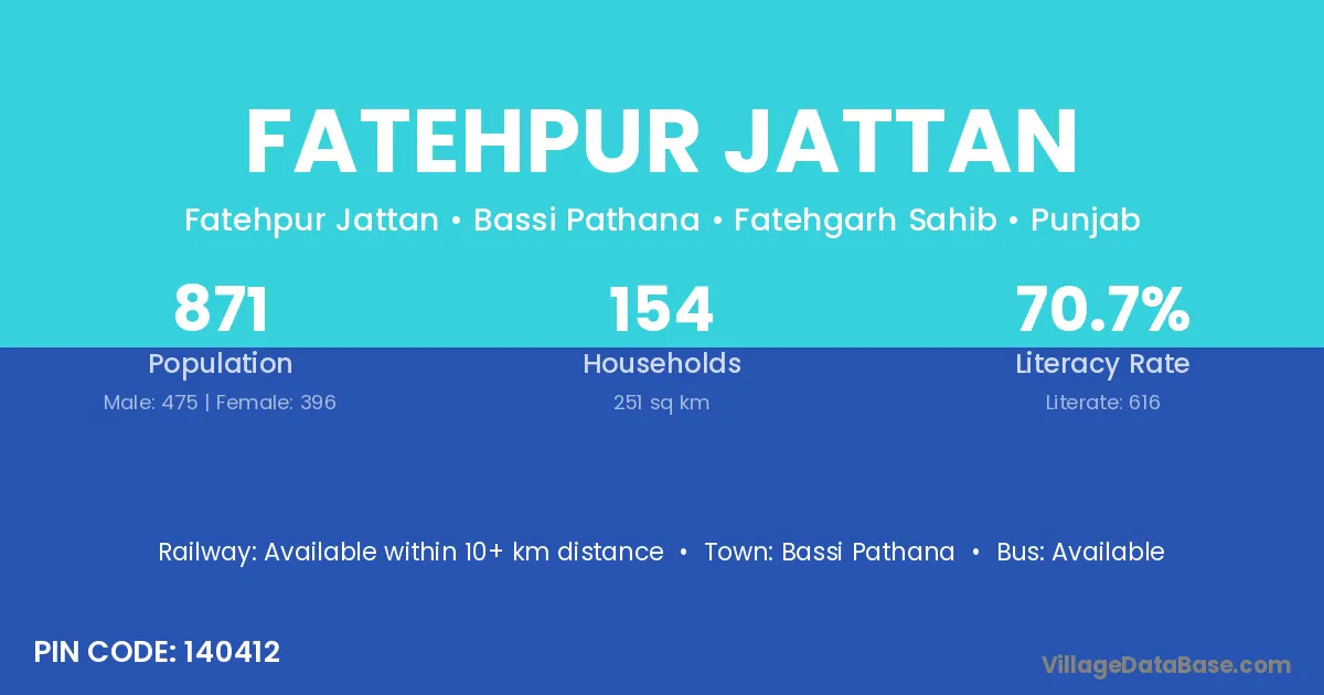 The literacy rate of Fatehpur Jattan village is 70.23%. Male literacy stands at 74.03% and female literacy at 66.21%.
