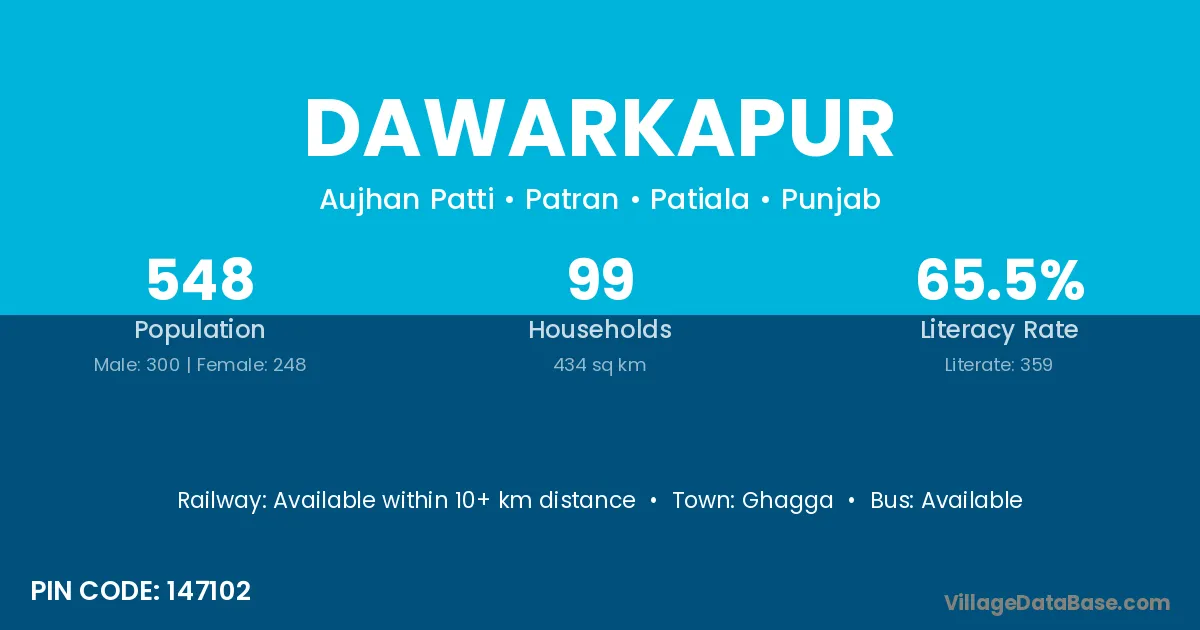 According to Census 2011 information, the village code of Dawarkapur village is 147102.