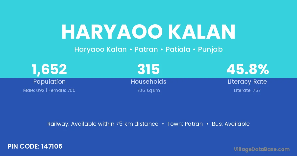 Haryaoo Kalan village has a total population of 1,652 people, of which 892 are males and 760 are females.