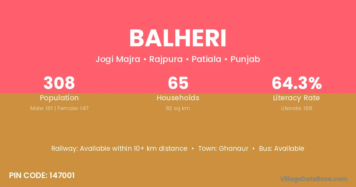 Balheri village has a total population of 308 people, of which 161 are males and 147 are females.