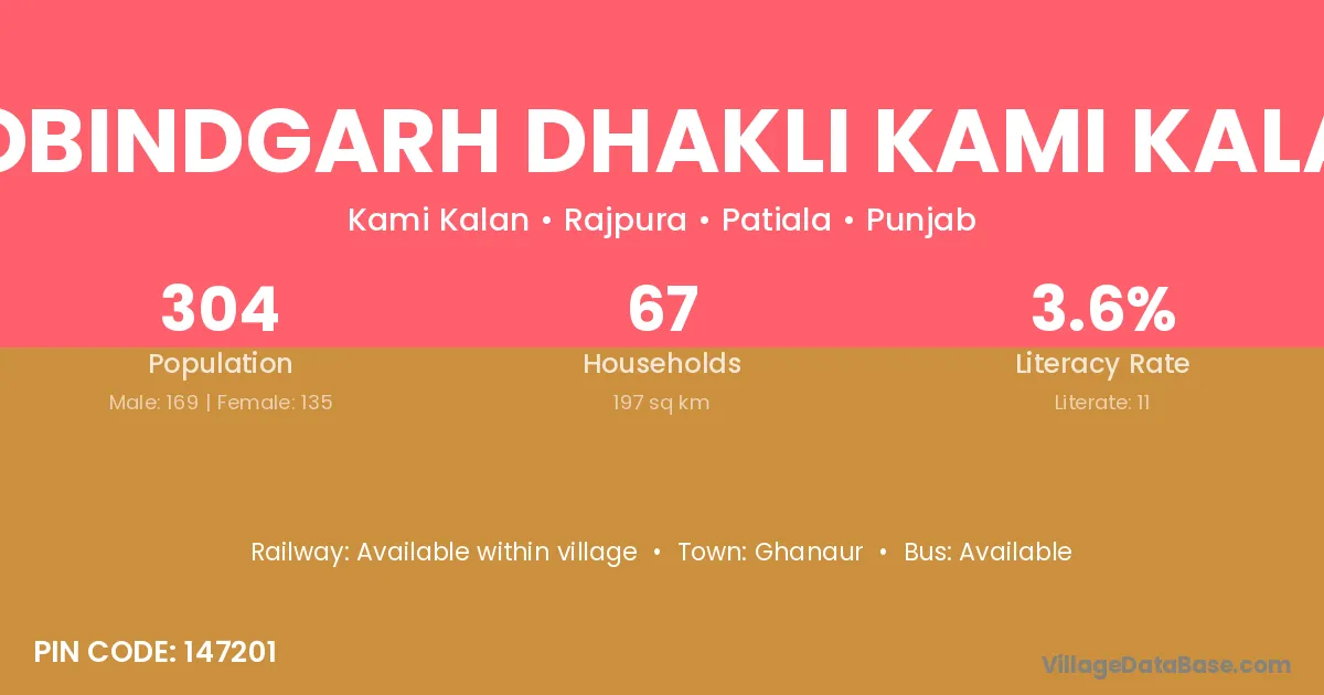 Gobindgarh Dhakli Kami Kalan village has a total population of 304 people, of which 169 are males and 135 are females.