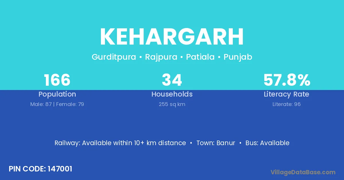 According to Census 2011 information, the village code of Kehargarh village is 147001.