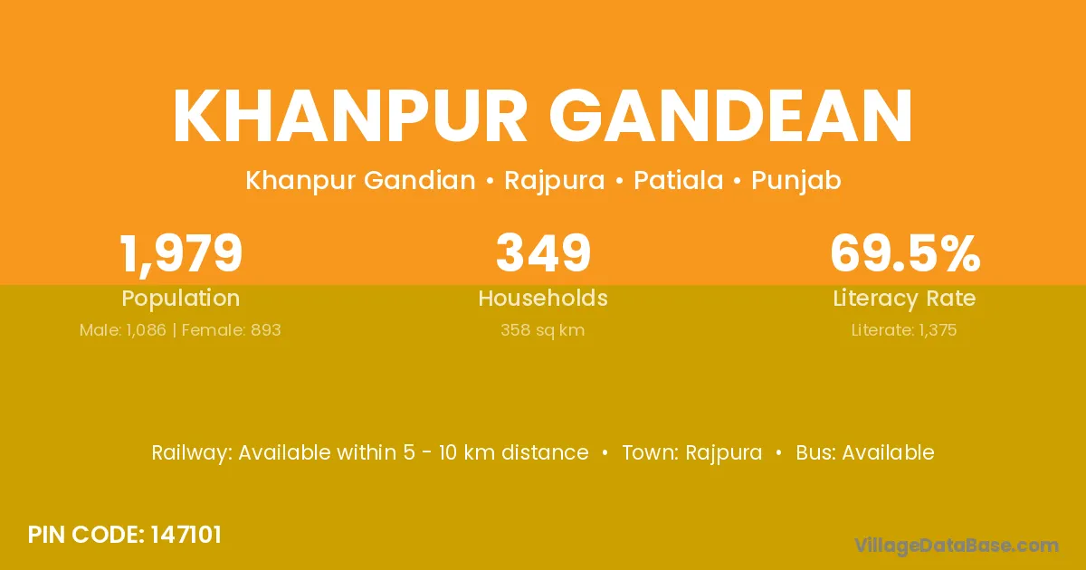 Khanpur Gandean village has a total population of 1,979 people, of which 1,086 are males and 893 are females.