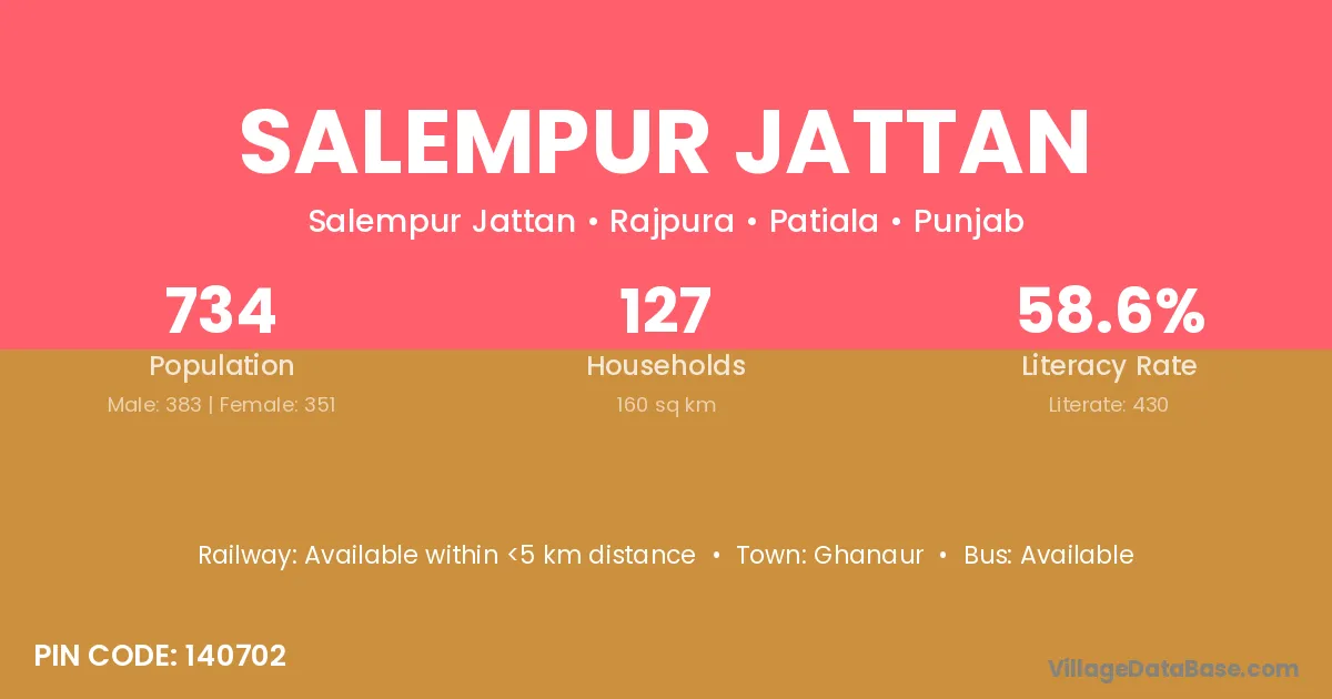 Salempur Jattan village has a total population of 734 people, of which 383 are males and 351 are females.