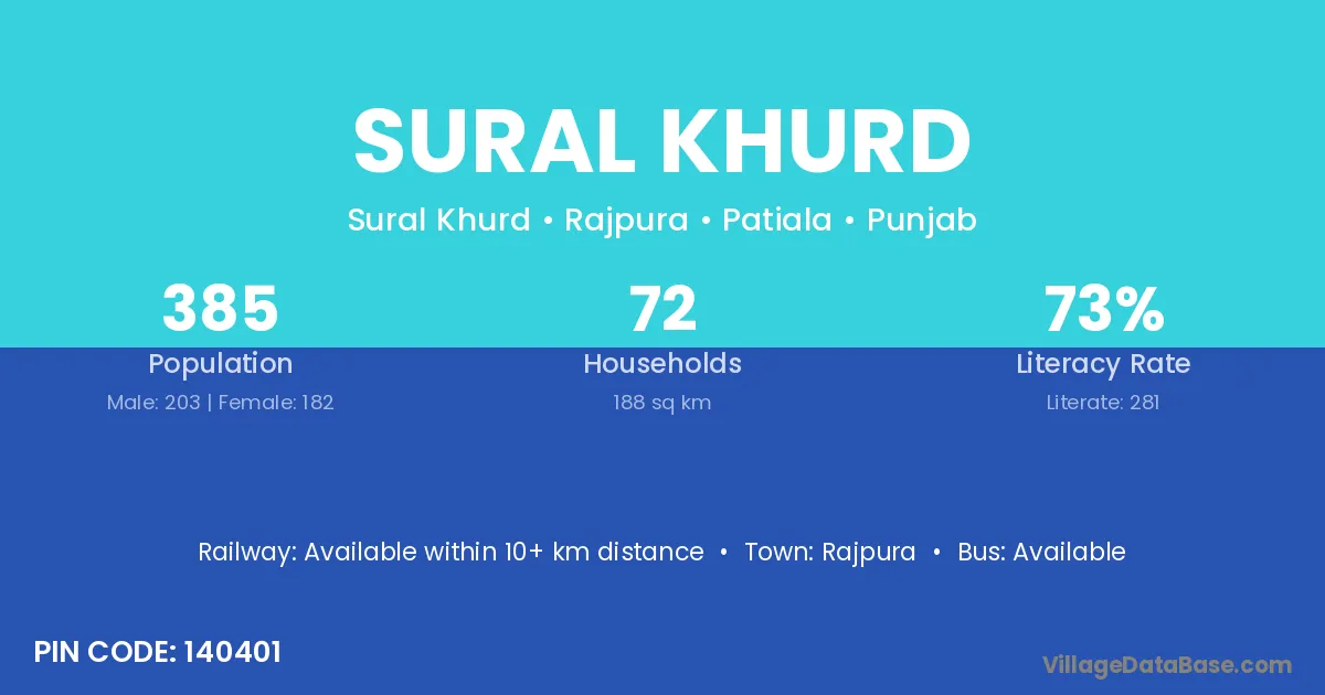 Sural Khurd village has a total population of 385 people, of which 203 are males and 182 are females.