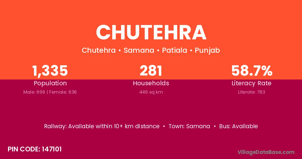 Chutehra village has a total population of 1,335 people, of which 699 are males and 636 are females.