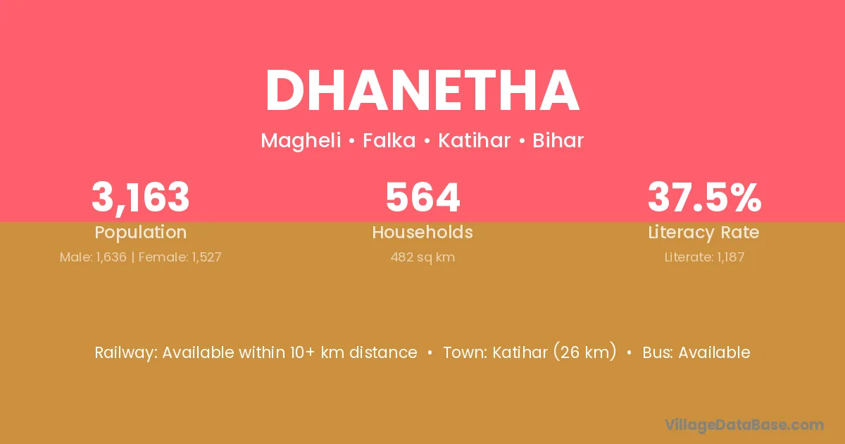 Dhanetha village has a total population of 3,862 people, of which 2,080 are males and 1,782 are females.