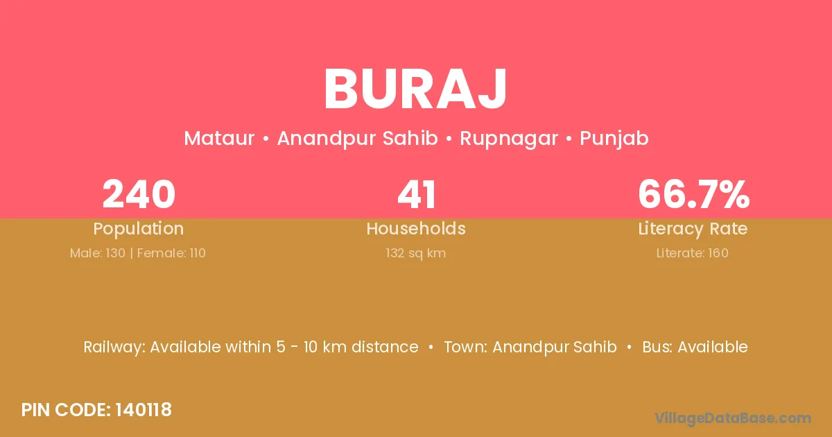 Buraj village has a total population of 240 people, of which 130 are males and 110 are females.