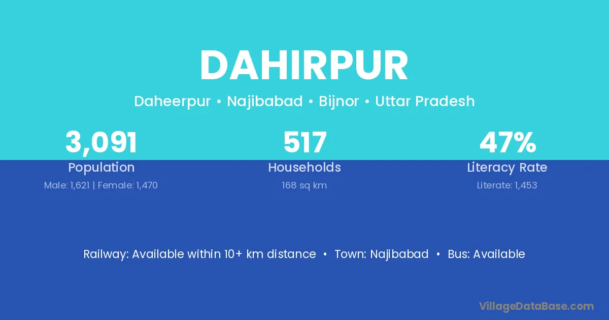 The literacy rate of Dahirpur village is 69.72%. Male literacy stands at 80.21% and female literacy at 57.98%.