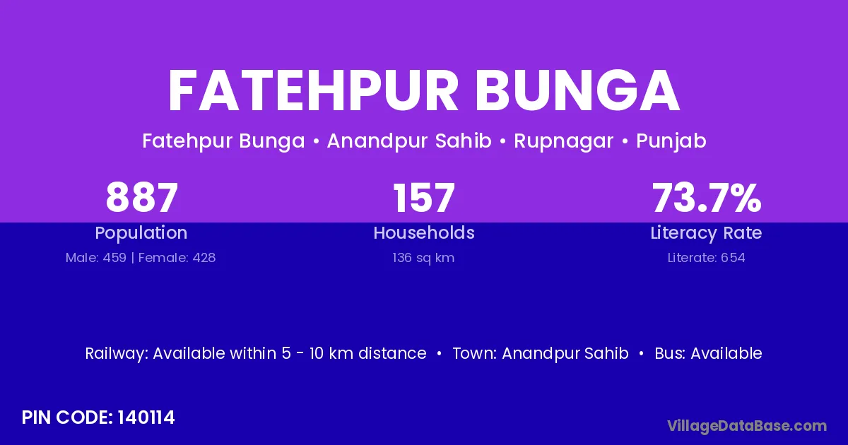 Fatehpur Bunga village has a total population of 887 people, of which 459 are males and 428 are females.