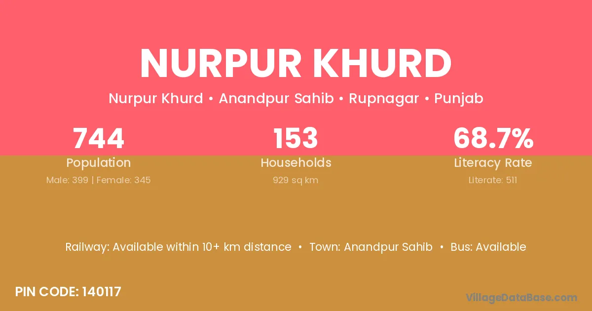 Nurpur Khurd village has a total population of 744 people, of which 399 are males and 345 are females.