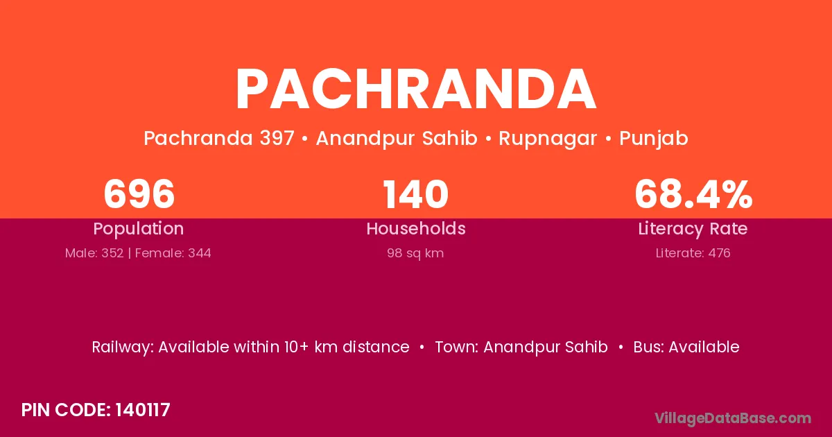 Pachranda village has a total population of 696 people, of which 352 are males and 344 are females.