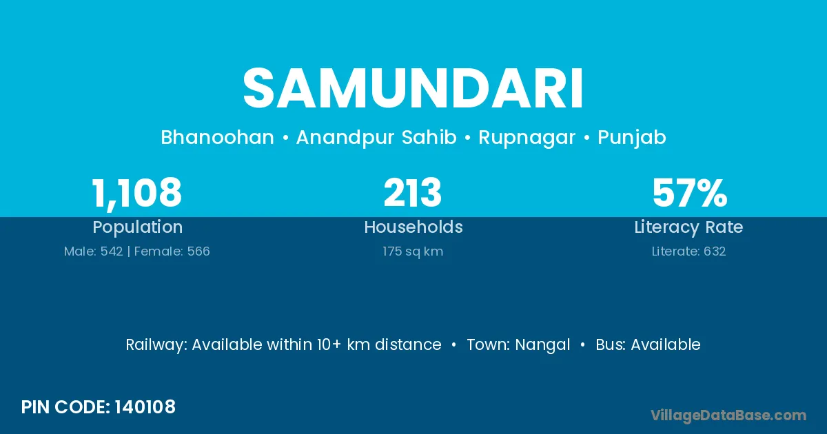 Samundari village has a total population of 1,108 people, of which 542 are males and 566 are females.