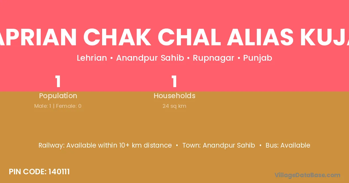 Taprian Chak Chal Alias Kujal village has a total population of 1 people, of which 1 are males and 0 are females.