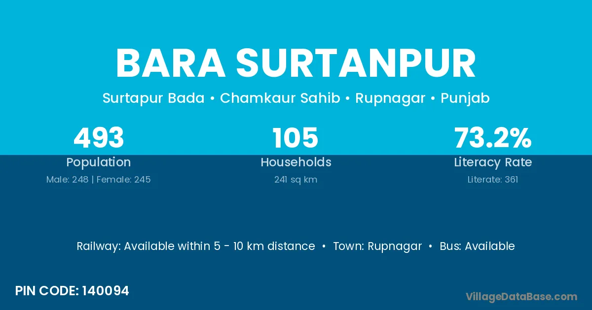 Bara Surtanpur village has a total population of 493 people, of which 248 are males and 245 are females.