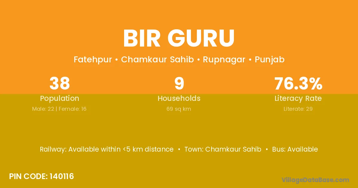 Bir Guru village has a total population of 38 people, of which 22 are males and 16 are females.