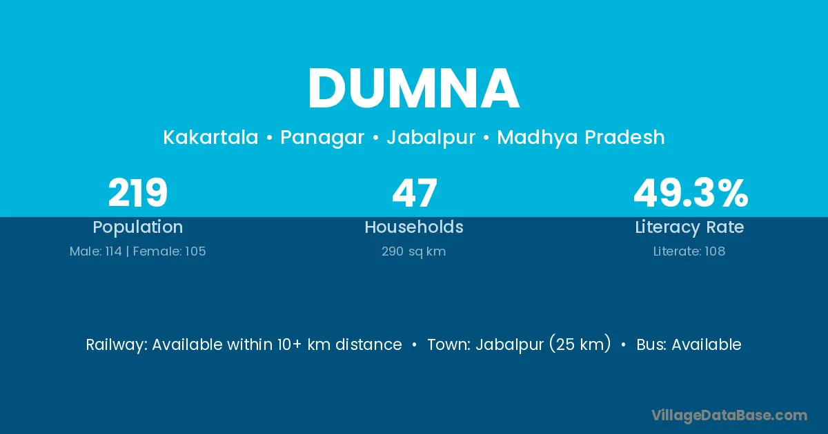The literacy rate of Dumna village is 73.75%. Male literacy stands at 77.37% and female literacy at 69.90%.