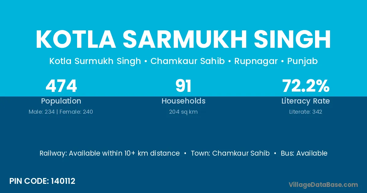 Kotla Sarmukh Singh village has a total population of 474 people, of which 234 are males and 240 are females.