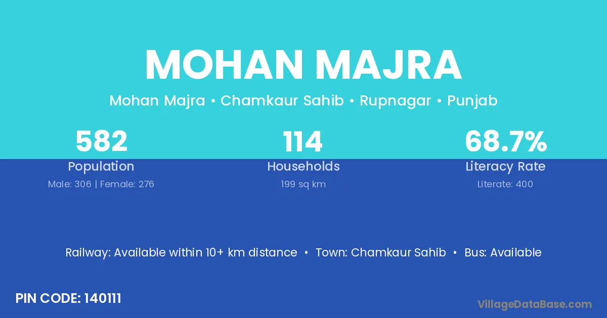 Mohan Majra village has a total population of 582 people, of which 306 are males and 276 are females.